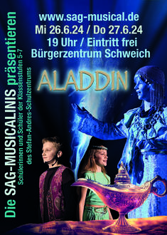 Gerne möchten wir Sie zu unserem zweiten Musical in diesem Schuljahr einladen. Die Musicalinis sind schon ganz aufgeregt, weil sie Ihnen das Musical „ALADDIN“ präsentieren dürfen. Das Musicalini-Ensemble des Stefan-Andres-Schulzentrums Schweich sind Schülerinnen und Schüler der Klassenstufen 5-7. Unterstützt werden sie von fleißigen größeren Schülerinnen und Schülern, welche auch als Akteure bereits selbst auf und hinter der Bühne in diesem Schulljahr eine tolle Leistung bei „Sister Soul“ erbracht haben. Alle Schülerinnen und Schüler haben auch in diesem Jahr voller Eifer Bühnenbilder gebaut, Kostüme zusammengestellt, technisch gearbeitet und geprobt, geprobt, geprobt, um Sie in eine magische Welt in Agrabah zu entführen. Die Geschichte ist jedem bekannt, doch lassen Sie sich überraschen von Ohrwürmen und atemberaubenden orientalischen Klängen. Das Musical "Aladdin" wird am 26. und 27.06.2024 jeweils um 19 Uhr im Bürgerzentrum Schweich aufgeführt. Einlass ins Foyer ist bereits um 18 Uhr. Dort können Sie es sich noch mit Getränken und kleinen Snacks gut gehen lassen. Der Eintritt ist frei.