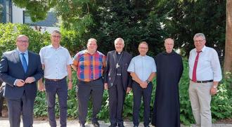 v.l.n.r.: Lars Rieger (Stadtbürgermeister Schweich), Manfred Wagner (Ortsbürgermeister Longuich), Kooperator Pfr. Axel Huber, Weihbischof Franz Josef Gebert, Pfr. Dr. Ralph Hildesheim (Leiter der Pfarreiengemeinschaft Schweich), Pater Benedikt Müntnich (emeritierter Abt der Abtei Maria Laach), Joachim Wagner (Erster Vorsitzender des Pfarreienrats Schweich). Leider nicht mehr auf dem Foto: Ortsbürgermeister Alfons Rodens aus Fell, der unmittelbar nach der Festmesse einen weiteren dienstlichen Termin wahrzunehmen hatte.