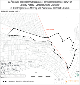 Die Geltungsbereiche der 32. Änderung des Flächennutzungsplanes umfassen eine Fläche von ca. 14,1 ha, wobei ca. 3,8 ha auf die Ortsgemeinde Mehring und ca. 7,1 ha auf die Ortsgemeinde Pölich sowie ca. 3,2 ha auf die Stadt Schweich entfallen.