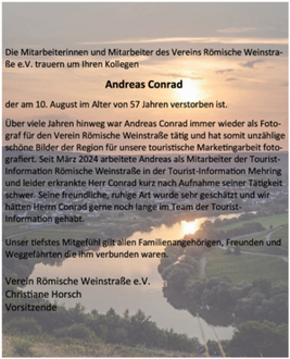 Über viele Jahren hinweg war Andreas Conrad immer wieder als Fotograf für den Verein Römische Weinstraße tätig und hat somit unzählige schöne Bilder der Region für unsere touristische Marketingarbeit fotografiert. Seit März 2024 arbeitete Andreas als Mitarbeiter der Tourist-Information Römische Weinstraße in der Tourist-Information Mehring und leider erkrankte Herr Conrad kurz nach Aufnahme seiner Tätigkeit schwer. Seine freundliche, ruhige Art wurde sehr geschätzt und wir hätten Herrn Conrad gerne noch lange im Team der Tourist-Information gehabt.
