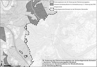 Der Verbandsgemeinderat Schweich hat am 22.11.2023 beschlossen, den Flächennutzungsplan zu ändern, um auf der Gemarkung Mehring weitere Flächen für die Nutzung der Windkraft darzustellen. Die betroffenen Flächen des Änderungsbereiches sind in der beigefügten Karte markiert. Dieser Beschluss wird gemäß § 2 Abs. 1 Baugesetzbuch bekanntgemacht.