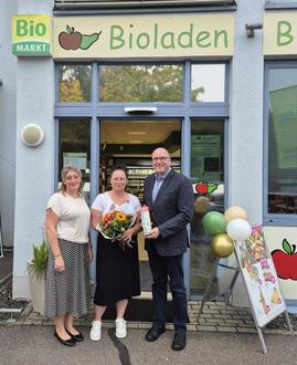 Stadtbürgermeister Lars Rieger bei der Gratulation zur Wiedereröffnung des Bioladens „Biotop“ mit den Neuinhaberinnen Nina Degen (l.) und Lisa Rösch (M.)