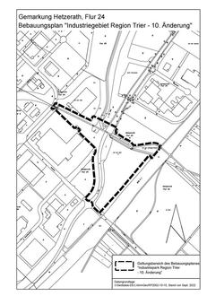 Der räumliche Geltungsbereich der Bebauungsplanänderung ist auf dem nachstehend abgedruckten Planausschnitt dargestellt. Gemäß § 10 Abs. 3 BauGB tritt der Bebauungsplan mit dieser öffentlichen Bekanntmachung in Kraft. Der Bebauungsplan, 10. Änderung, mit der Begründung und der zusammenfassenden Erklärung wird während der Dienststunden bei der Geschäftsstelle des Zweckverbandes Industriepark Region Trier, Europa-Allee 1, 54343 Föhren, zu jedermanns Einsicht bereitgehalten und es wird auf Verlangen über den Inhalt Auskunft gegeben.