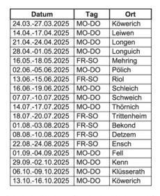 Diese Gebühren enthalten Kosten für Strom, Wasser, Infrastruktur sowie die Gestattungsgebühr der Stadt Trier. Diese Gebühren gelten bei Terminen von 3 bzw. 4 Tagen mit einem Winzer. Bei Teilung von Terminen auf zwei Winzer (Teilung ist nur von Montag-Donnerstag möglich) fallen pro Winzer jeweils 50% dieser Gebühr, zzgl. je 37,50 EUR an. Eine weitere Teilung von Terminen ist nicht möglich. Darüber hinaus werden ab 2025 schriftliche Nutzungsverträge zwischen der TTM und dem jeweiligen Betreiber abgeschlossen. Bestandteil des Nutzungsvertrages ist der u.a. Nachweis einer Haftpflichtversicherung (Betriebshaftpflicht) des Weinstandbetreibers. Zusätzlich zu dieser Grundgebühr werden 8,4% Umsatzprovision auf den Weinumsatz am Stand berechnet – nicht eingerechnet wird der Umsatz mit Pfandgläsern oder Pfandflaschen und der Verkauf von Flaschen zur Lieferung nach Hause. Alle Gebühren/Umsatzprovision gelten zzgl. 19% MWST. Zwei Ortsgemeinden haben in diesem Jahr jeweils zwei Termine. Bei der Vergabe ist darauf zu achten, dass ein Weingut nur einmal pro Jahr einen Termin wahrnehmen darf! Der Stand im Jahr 2025 ist von den weinbautreibenden Gemeinden der Römischen Weinstraße ist wie folgt zu besetzen: