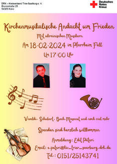 Am 1. Fastensonntag, dem 18.02.2024 um 17:00 Uhr feiern wir im Pfarrheim in Fell mit zwei Instrumentalisten Nataliia Kharkivska (Violine) und Valeriy Kharkivsky (Horn) aus der Ukraine eine kirchenmusikalische Andacht um Frieden mit Werken von Vivaldi, Bach, Schubert, Masanet sowie ukrainischen Volksweisen. Im Anschluss an die Andacht besteht die Gelegenheit zum gemütlichen Beisammensein und Austausch mit den Musikern und der Sängerin. Um eine Spende zur Unterstützung der Ukrainehilfe wird gebeten.