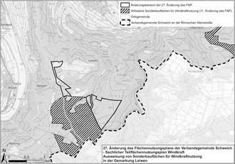Der Verbandsgemeinderat Schweich hat beschlossen, weitere Flächen für die Nutzung der Windkraft auf der Gemarkung Leiwen darzustellen. Die betroffenen Flächen des Änderungsbereiches sind in der beigefügten Karte markiert.