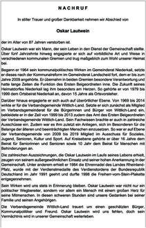 Oskar Lautwein war ein Mann, der sein Leben in den Dienst der Gemeinschaft stellte. Über fünf Jahrzehnte hinweg engagierte er sich auf vorbildliche Art und Weise in verschiedenen kommunalen Gremien und trug maßgeblich zum Wohl unserer Heimat bei.