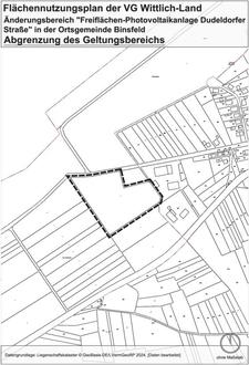 Die Planunterlagen zur Beteiligung der Öffentlichkeit werden auf der Internetseite der Verbandsgemeinde Wittlich-Land unter www.vg-wittlich-land.de bereitgehalten und können dort eingesehen werden. Den Link zu den Beteiligungsunterlagen finden Sie unter Aktuelles / Bauleitplanung / OG Binsfeld – „Freiflächen-Photovoltaikanlage Dudeldorfer Straße“.
