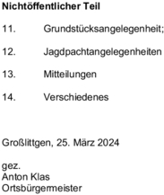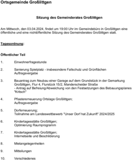 Am Mittwoch, den 03.04.2024, findet um 19:00 Uhr im Gemeindebüro in Großlittgen eine öffentliche und eine nichtöffentliche Sitzung des Gemeinderates Großlittgen statt.