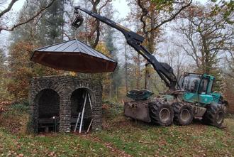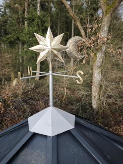 In der Werkstatt der Zimmerei und Spenglerei Tombers wurde das neue Dach angefertigt und im fertigen Zustand nach Buchholz transportiert, wo es mit Hilfe von Revierförster Fox und seinem Team auf den Pavillon aufgesetzt wurde. Ein besonderer Dank gilt Zimmer- & Spenglermeister Jonathan Tombers, dessen handwerkliches Geschick in besonderem Maße gefordert war, da das Gebäude nicht symmetrisch erbaut wurde und der Dachstuhl somit genau angepasst werden musste. Er spendete auch die neue Messing-Wetterfahne, die der des Freiburger Münsters nachempfunden ist und sich aus Halbmond und Sonne, den Zeichen der Herrschaft Christi bei Tag & Nacht, zusammensetzt.