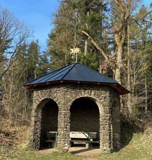 Bereits 1872 erbaute der Verschönerungsverein Manderscheid an der Stelle mit dem tollen Blick auf das aufstrebende Manderscheid bis hin zum Mosenberg einen Pavillon mit Reetdach.