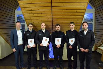 v.l.n.r. Bürgermeister Manuel Follmann, Jens Leyendecker, Julian Backendorf, Samuel May, Florian Reis und Wehrleiter David Backendorf