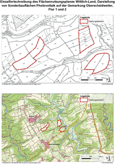 Die Planunterlagen zur Beteiligung der Öffentlichkeit werden auf der Internetseite der Verbandsgemeinde Wittlich-Land unter www.vg-wittlich-land.de bereitgehalten und können dort eingesehen werden. Den Link zu den Beteiligungsunterlagen finden Sie unter Aktuelles / Bauleitplanung / OG Oberscheidweiler – Sondergebiet Photovoltaik „Solarpark Oberscheidweiler“.