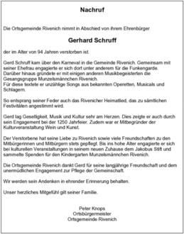 Der Verstorbene hat seine Liebe zu Rivenich sowie viele Freundschaften zu den Mitbürgerinnen und Mitbürgern stets gepflegt. Bis ins hohe Alter engagierte er sich bei kulturellen Veranstaltungen in seinem neuen Zuhause dem Jakobus Stift und sammelte Spenden für den Kindergarten Munzelsmännchen Rivenich.