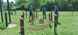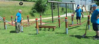 Auf dem Spielplatz in Gladbach gibt es jetzt eine neue Balance-Motorikstrecke! Die Gemeindearbeiter haben drei aufregende Elemente aufgebaut: ein Fischernetz, eine Räuberleiter und eine Artistenbrücke.“