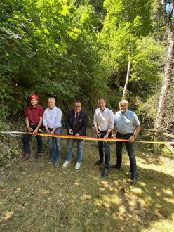 Bevor die Redner im Anschluss das Band durchschnitten und damit offiziell den Burgen-Klettersteig eröffneten, segnete Pastor Eich den Steig mit den Worten „Viele Wege führen zu Gott. Einer geht über die Berge.“