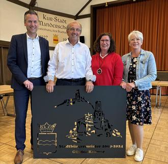 Im Rahmen der konstituierenden Sitzung des Stadtrats Manderscheid wurden am 08.07.24 im Kurhaus 10 neue Ratsmitglieder verpflichtet. Im Anschluss daran fand die Ernennung der neuen Stadtbürgermeisterin Claudia Becker durch den scheidenden Bürgermeister Günter Krämer statt. Nach dem feierlichen Akt, dem auch Verbandsbürgermeister Manuel Follmann beiwohnte, dankte die neue Stadtbürgermeisterin in ihrer Antrittsrede ihren Unterstützern und verabschiedete sodann Günter Krämer, der nach 15 Jahren als Stadtbürgermeister vom Stadtrat eine stählerne Tafel mit der Silhouette der Burgen als Andenken und zum Dank für seinen Einsatz in den letzten Jahren geschenkt bekam.