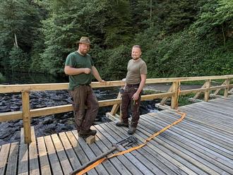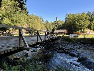 Beim Genehmigungsverfahren zum Burgenfest wurde nach der aktuellen Gesetzgebung zur Durchführung von Veranstaltungen in den vergangenen Jahren die Fluchtwegssituation von der Turnierwiese zur L16 nach Niedermanderscheid bemängelt. Die Brücke an der Turnierwiese war zu schmal, da sie mindestens die Breite der engsten Stelle des Weges bis zur L16 aufweisen muss. In den vergangenen Jahren hat der Burgenverein dies durch den Bau einer 2. Behelfsbrücke zum Burgenfest kompensieren können. Dank eines privaten Spenders konnte die bestehende Brücke nun auf die erforderliche Breite ausgebaut werden. Die Materialkosten konnten durch die großzügige Spende gedeckt werden und die Brücke durch unsere Forstarbeiter (Foto: Andreas Hemmerling und Maurice Leclaire) in Eigenleistung errichtet werden.
