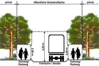 Wir weisen ausdrücklich darauf hin, dass die Verkehrssicherung nicht nur Sache der Ortsgemeinde ist, sondern dass auch die Besitzer der Grundstücke – ob bebaut oder unbebaut – entlang der Straßen für die Verkehrssicherheit mitverantwortlich sind. Die Abbildung verdeutlicht die notwendige lichte Höhe. Auf Geh- und Radwegen beträgt diese mindestens 2,50 m und auf der Fahrbahn 4,50 m. Äste sind bis zu dieser Höhe zurückzuschneiden und auch sonst darf in dieses Lichtraumprofil kein Bewuchs hineinwachsen.