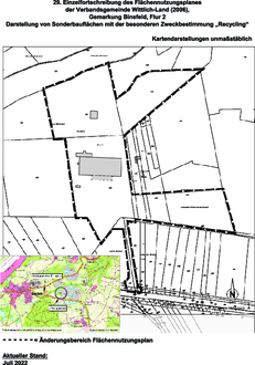 Der Verbandsgemeinderat Wittlich-Land hat in seiner Sitzung am 08.09.2021, TOP 7 b), beschlossen, den Flächennutzungsplan Wittlich-Land 2006 für Flächen der Gemarkung Binsfeld, Flur 2, zur Darstellung von Sonstigen Sonderbauflächen mit der besonderen Zweckbestimmung „Recycling“ fortzuschreiben (Planaufstellungsbeschluss). Der Beschluss des Verbandsgemeinderates wird hiermit förmlich gemäß § 2 Abs. 1 Satz 2 Baugesetzbuch (BauGB) bekannt gemacht (Auszug):
