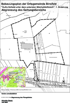 Der Gemeinderat Binsfeld hat in seiner Ratssitzung am 04.07.2022 den Entwurf des Bebauungsplanes „Aufm Scheid unter dem untersten Wacholderbusch - 1. Änderung“ für die Offenlage gebilligt und beschlossen, die Beteiligung der Öffentlichkeit gemäß § 3 Abs. 2 BauGB durchzuführen