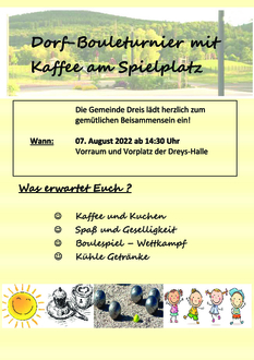 Sehr gerne laden wir neben unseren Ortsvereinen auch alle Bürgerinnen und Bürger ein, die Interesse am Boulespiel haben. Ob erfahrener Spieler oder Anfänger, unser Turnier eignet sich für Euch alle und Spaß am Spiel steht an diesem Nachmittag im Vordergrund.