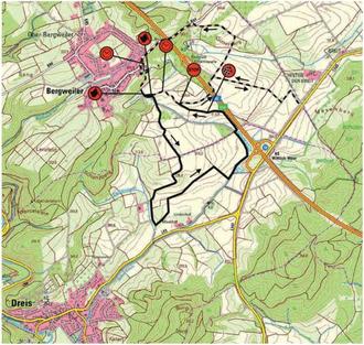 die Wertungsprüfung „Dr. Oetker Bergweiler“ wird auf Wirtschaftswegen zwischen Bergweiler und Dreis befahren.