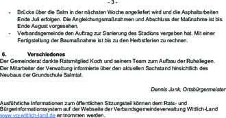 | - | Verbandsgemeinde den Auftrag zur Sanierung des Stadions vergeben hat. Mit einer Fertigstellung der Baumaßnahme ist bis zu den Herbstferien zu rechnen. |