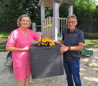 Die Basargemeinschaft Großlittgen spendete in einer spontanen Aktion eine Aufbewahrungskiste mit Spielzeug für den Sandkasten und Kochutensilien für die Kinderküche unter der großen Rutsche.