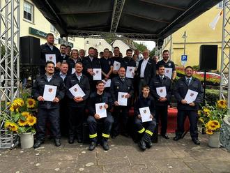 Anschließend wurde Sarah Schulz (Eisenschmitt) zur Feuerwehrfrau sowie Andreas Rob, (Eisenschmitt), Finn Luca Klein, Philipp Mohr, Maurice Severin, Christoph Walter Kerpen, David Zens (Bettenfeld), Jonas Ludwig, Gabriel Schmitz, Jonas Tombers, Lois Tombers (Meerfeld) zum Feuerwehrmann befördert.