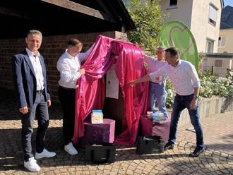 Gemeinsam enthüllen Vertretende der Stadt und von Westenergie den neuen Bücherschrank in Dreis (v. l.): Marco Felten (Westenergie-Regionalmanager), Christoph Thieltges (Ortsbürgermeister), Julitta Kuhnen (Bücherpatin) und Manuel Follmann (Bürgermeister der Verbandsgemeinde Wittlich-Land). (Foto: Westenergie AG/Gina Hoffmann)