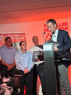 In ihren Grußworten gratulierten Ortsbürgermeisterin Kohl-Molitor, Landrat Hackethal und Bürgermeister Follmann der Brucher Wehr herzlich zum besonderen Jubiläum. Sie würdigten das hohe Engagement, die Einsatzbereitschaft und die unverzichtbare Rolle nicht nur der Brucher Feuerwehr, sondern aller ehrenamtlichen Wehren in der Region.