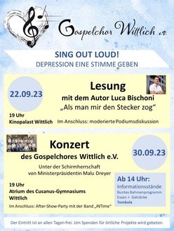 Daher hat sich der Gospelchor Wittlich zum Ziel gesetzt, das Thema Depression aufzugreifen und in die Öffentlichkeit zu tragen. Neben einem Konzert des Chors am 30. September 2023 erwartet die Gäste zudem ein umfangreiches Rahmenprogramm mit Autorenlesung, Podiumsdiskussion und Informationsmesse, um so mehr Aufmerksamkeit zu genieren.
