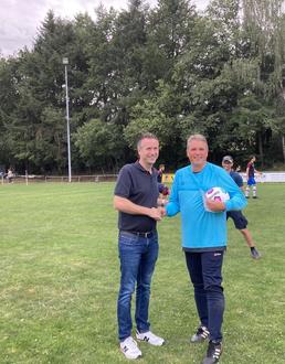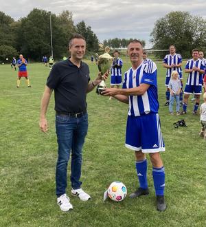 Bürgermeister Manuel Follmann und der Spielführer der AH Laufeld, Michael Weber, bei der Siegerehrung.