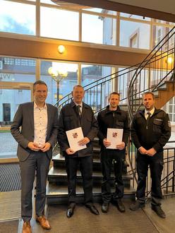 Follmann und Backendorf dankten im Beisein der Wehrführer Walesch und Feltes den neuen Führungskräften für die Bereitschaft, Verantwortung in der Verbandsgemeindefeuerwehr zu übernehmen.
