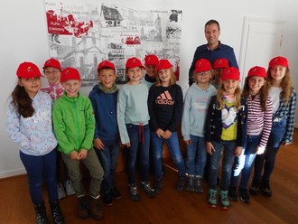 Von Bürgermeister Manuel Follmann im Foyer des Rathauses empfangen ging es für die Schülerinnen und Schüler in den Sitzungssaal. Dort lag bereits für jedes Kind eine kleine Überraschung zusammen mit einer kindgerecht gestalteten Infomappe über die Verbandsgemeinde bereit.