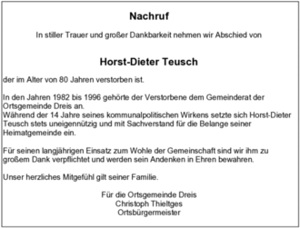 In den Jahren 1982 bis 1996 gehörte der Verstorbene dem Gemeinderat der Ortsgemeinde Dreis an.