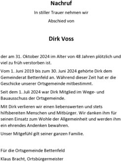 Mit Dirk verlieren wir einen liebenswerten und stets hilfsbereiten Menschen und Mitbürger. Wir danken ihm für seinen Einsatz zum Wohle der Allgemeinheit und werden ihm ein ehrendes Andenken bewahren.