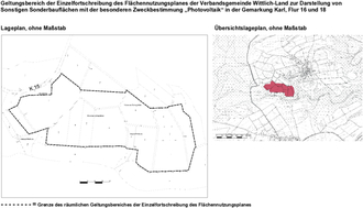 Der Verbandsgemeinderat Wittlich-Land hat in seiner Sitzung am 9. Oktober 2024, TOP 16 b), beschlossen, den Flächennutzungsplan Wittlich-Land für Flächen der Gemarkung Karl, Flur 16 und 18, zur Darstellung von Sonstigen Sonderbauflächen mit der besonderen Zweckbestimmung „Photovoltaik“ fortzuschreiben (Planaufstellungsbeschluss). Der Beschluss des Verbandsgemeinderates wird hiermit förmlich gemäß § 2 Abs. 1 Satz 2 Baugesetzbuch (BauGB) bekannt gemacht (Auszug):