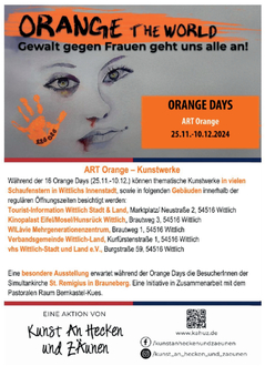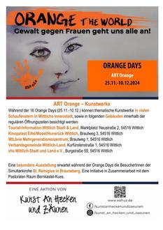 Die Verbandsgemeinde Wittlich-Land lädt in Kooperation mit dem Verein „Kunst an Hecken und Zäunen e.V.“ zu einer besonderen Kunstausstellung ein. Im Rahmen der internationalen Kampagne „Orange Days“, die auf Gewalt gegen Frauen und Mädchen aufmerksam macht, wird die Ausstellung „Orange Art“ präsentiert. Ab dem 18. November 2024 sind die Kunstwerke in den Räumlichkeiten der Verbandsgemeinde Wittlich-Land zu sehen, sowohl im Foyer der Hauptstelle als auch in den Schaufenstern der Außenstelle in der Burgstraße.