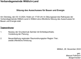 Am Dienstag, den 03.12.2024, findet um 17:00 Uhr im Sitzungssaal des Rathauses der Verbandsgemeinde Wittlich-Land in Wittlich eine öffentliche Sitzung des Ausschusses für Bauen und Energie statt.