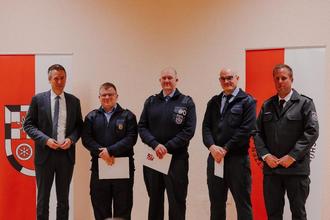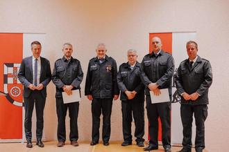 v.l.n.r. Manuel Follmann, neuer Wehrführer der Feuerwehr Platten Thomas Staudt, scheidender Wehrführer Dieter Treimetten, scheidender stellvertretender Wehrführer Hans-Josef Gödert neuer kom. stellvertretender Wehrführer Fabian Jüngling, Wehrleiter David Backendorf