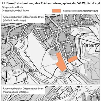 Der Verbandsgemeinderat Wittlich-Land hat in seiner Ratssitzung am 25.06.2025 die Abwägung zu den im Zuge der bisherigen Beteiligungen eingegangenen Stellungnahmen (Abstimmung mit den Nachbargemeinden gemäß § 2 Abs. 2 BauGB, frühzeitige Öffentlichkeitsbeteiligung gemäß § 3 Abs. 1 BauGB sowie Behördenbeteiligung gemäß § 4 Abs. 1 BauGB) durchgeführt und den Entwurf der 41. Einzelfortschreibung des Flächennutzungsplanes Wittlich-Land, Gemarkung Dreis, Flur 10 und 14 sowie Gemarkung Großlittgen, Flur 3 für die Offenlage beschlossen.