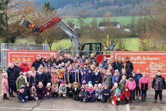 Bürgermeister Manuel Follmann äußerte sich erfreut über den Beginn der Arbeiten und stellte die Kinder an diesem Vormittag in den Mittelpunkt seiner Ansprache. Beim Spatenstich waren daher alle eifrig mit dabei und freuen sich über den Start der Schulbaumaßnahme.