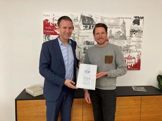Geschäftsführer Tim Weber, BGF GmbH überreichte Bürgermeister Manuel Follmann das Zertifikat "Top Arbeitgeber Gesundheitsförderung 2024".