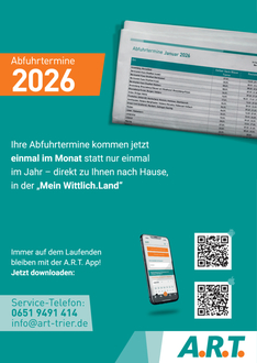 Auch im Jahr 2026 können sich die Bürger im Landkreis Bernkastel-Wittlich wieder über verschiedene Wege über die Abfuhrtermine für ihre Abfälle informieren. Wie gewohnt sind die neuen Termine ab sofort auf der Webseite https://www.art-trier.de/abfuhrtermin einsehbar. Dort kann der persönliche Abfuhrkalender für den eigenen Ort heruntergeladen und für die Pinnwand ausgedruckt werden. Auch ein Erinnerungsservice per E-Mail oder die Möglichkeit zum Import der Abfuhrtermine in einen digitalen Kalender stehen zur Verfügung. Wer bequem per Push-Benachrichtigung an seine Abfuhrtermine erinnert werden möchte, lädt sich einfach die A.R.T. App aufs Handy.
