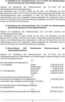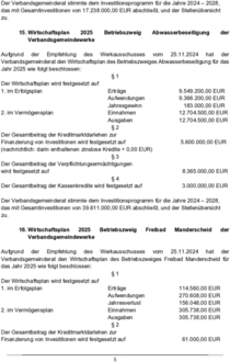 Aufgrund der Empfehlung des Werkausschusses vom 25.11.2024 hat der Verbandsgemeinderat den Wirtschaftsplan des Betriebszweiges Abwasserbeseitigung für das Jahr 2025 wie folgt beschlossen: