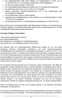 Die Personalkosten, die einen großen Anteil des Ergebnishaushalts ausmachen, stehen oft im Fokus der Diskussion. Für uns als CDU-Fraktion steht allerdings fest: Unsere Verwaltung ist das Rückgrat der Verbandsgemeinde. Sie bildet das Fundament unserer Arbeit und stärkt uns den Rücken für politische Entscheidungen. Ohne die engagierte Zuarbeit der Mitarbeiterinnen und Mitarbeiter wäre die Umsetzung der zahlreichen Projekte sowie die Bewältigung des Alltags in all unseren Gemeinden nicht möglich. Ihr Einsatz verdient nicht nur Anerkennung, sondern auch unsere volle Unterstützung.