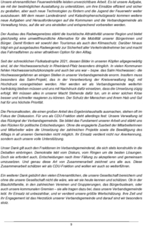 Unser Dank gilt auch den Fraktionen im Verbandsgemeinderat, die sich stets konstruktiv in die Debatten einbringen. Demokratie lebt vom Diskurs, vom Ringen um die besten Lösungen. Doch sie erfordert auch, Entscheidungen nach ihrer Fällung zu akzeptieren und gemeinsam umzusetzen. Und genau diese Art von Zusammenarbeit zeichnet uns alle aus. Diese Zusammenarbeit schätzen wir als CDU-Fraktion und wollen wir auch so weiterführen.