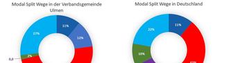 Modal Split Verbandsgemeinde Ulmen und Deutschland im Vergleich. In der Befragung gab es nicht die Möglichkeit „Carsharing“ auszuwählen, daher ist der Anteil in der Verbandsgemeinde Ulmen mit 0 % angegeben.